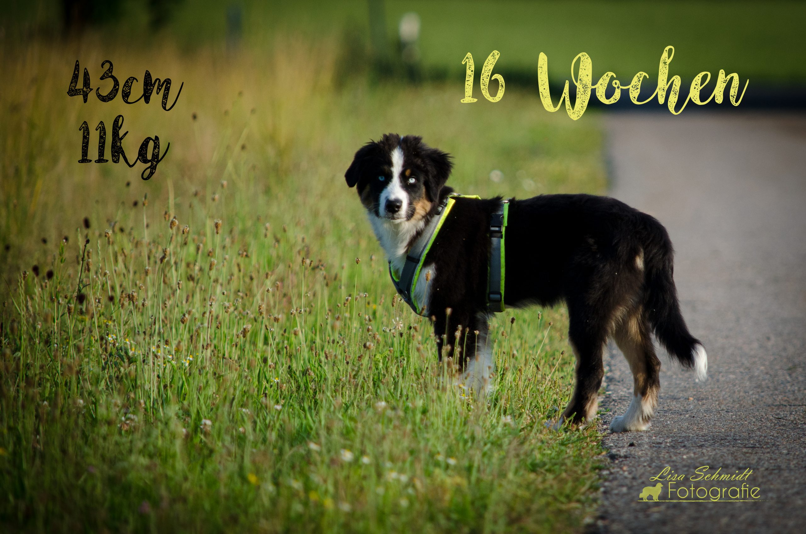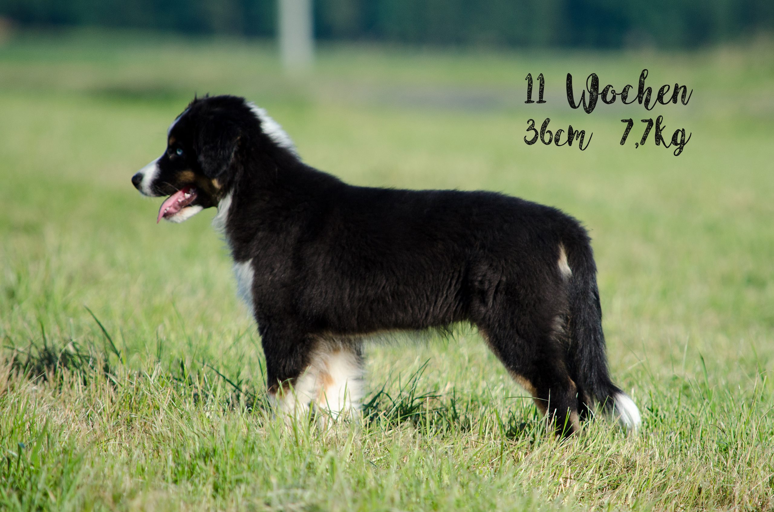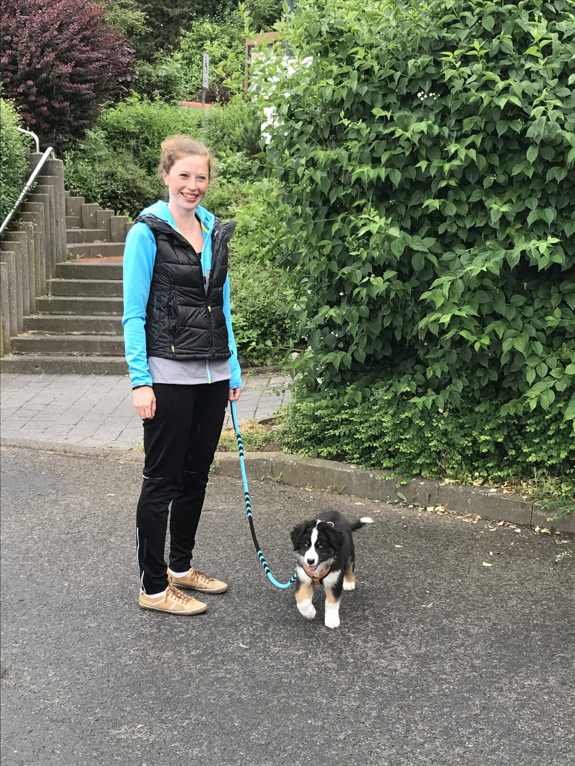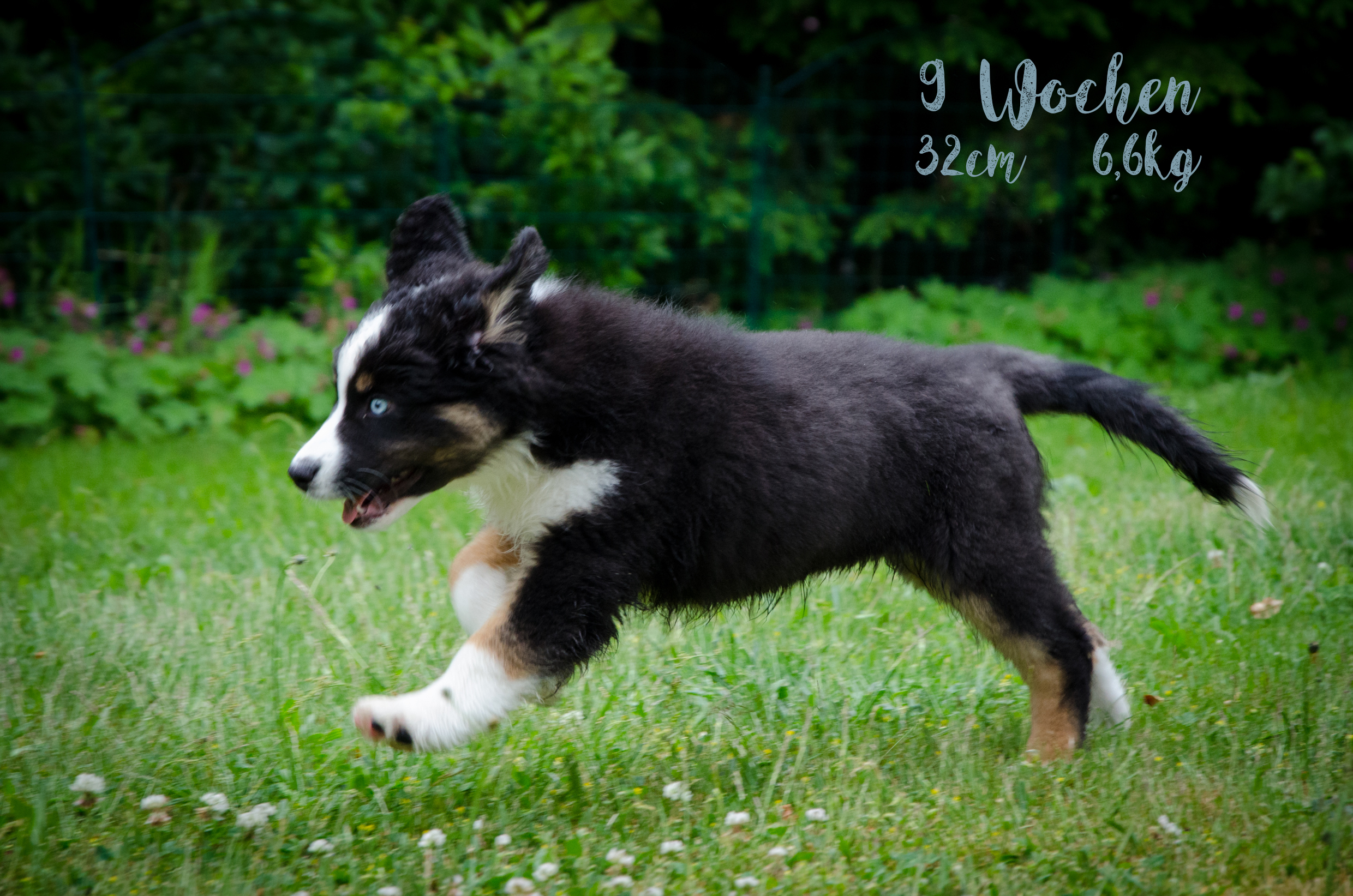 Er war lange geplant und ich hatte sooo viele Anforderungen an ihn bzw. an seine Eltern: freundlich und offen gegenüber Menschen zu sein, hatte oberste Priorität. Er sollte eher Arbeitslinie und möglichst klein und wendig sein. Im Agility macht das einfach mehr Sinn und da ich für mich eigentlich nie einen Rüden wollte, sollte er dann wenigstens „Hündinnen-Format“ haben 😉 Optisch hatte ich auch einige Ansprüche: Schwarz, das passt gut zum Blue Merle und hätte mir schon immer gut gefallen. Maximal eine schmale Blesse, damit er nicht für einen Berner Sennenhund gehalten wird. Ich habe deutschlandweit und darüber hinaus mit Züchtern Kontakt aufgenommen, bin mit meiner Mama einmal quer durch Deutschland zu einem Wurf gefahren, aber die Suche gestaltete sich schwierig. Durch Zufall stieß ich dann auf einen frisch geschlüpften Wurf bei Koblenz. Die Welpen hatten für meinen Geschmack alle etwas viel Weiß, nur ein schwarzer Rüde könnte optisch erwachsen evtl. doch ok sein. Ich bin in der Hinsicht echt wählerisch, aber meiner Meinung nach sollte mir mein Hund schon auch gefallen 😀
