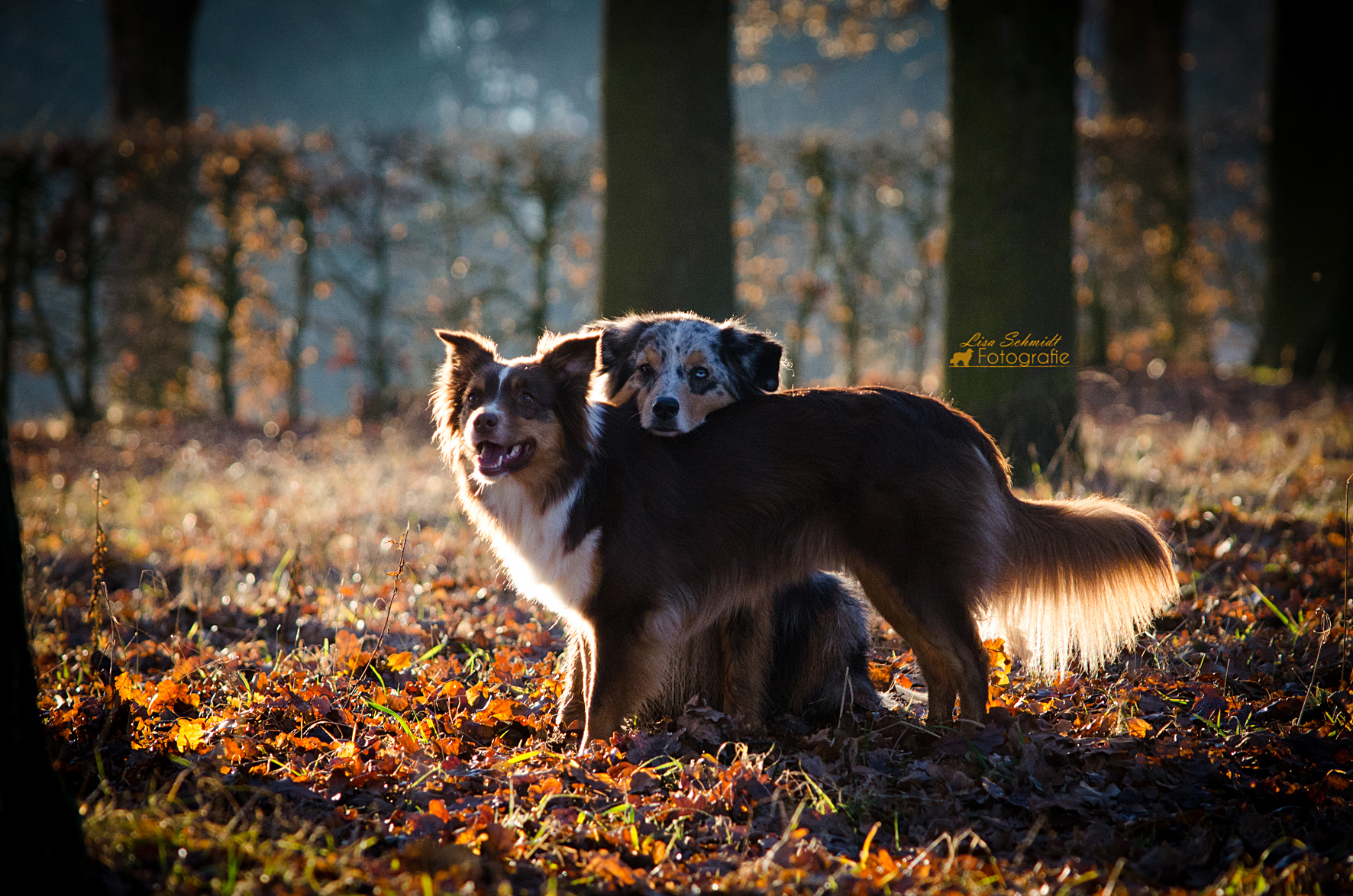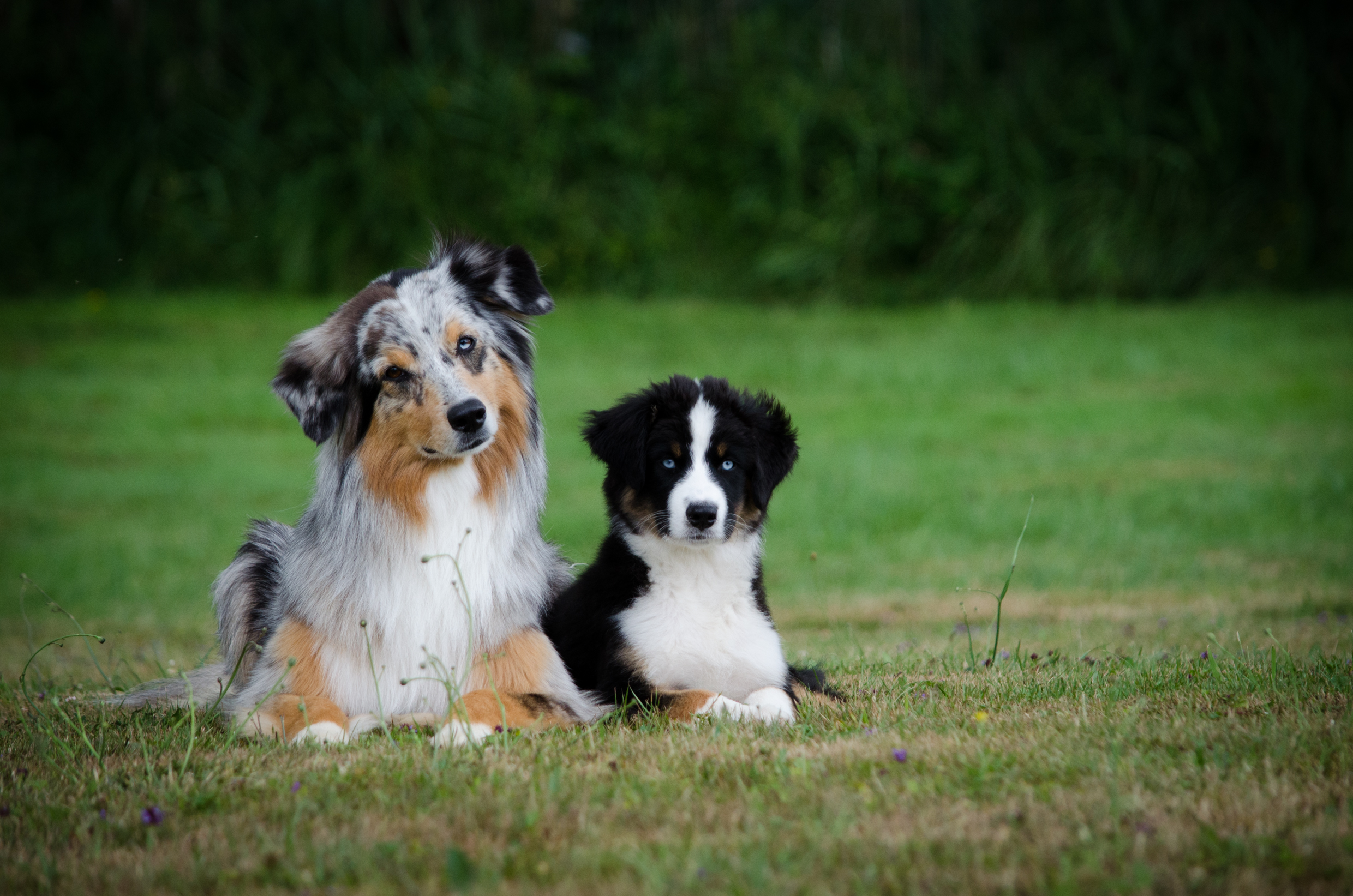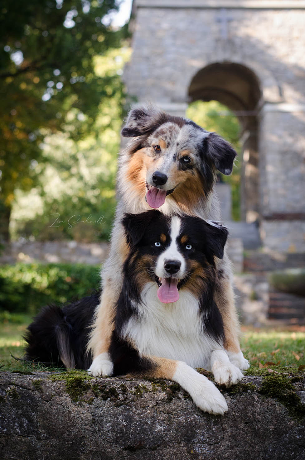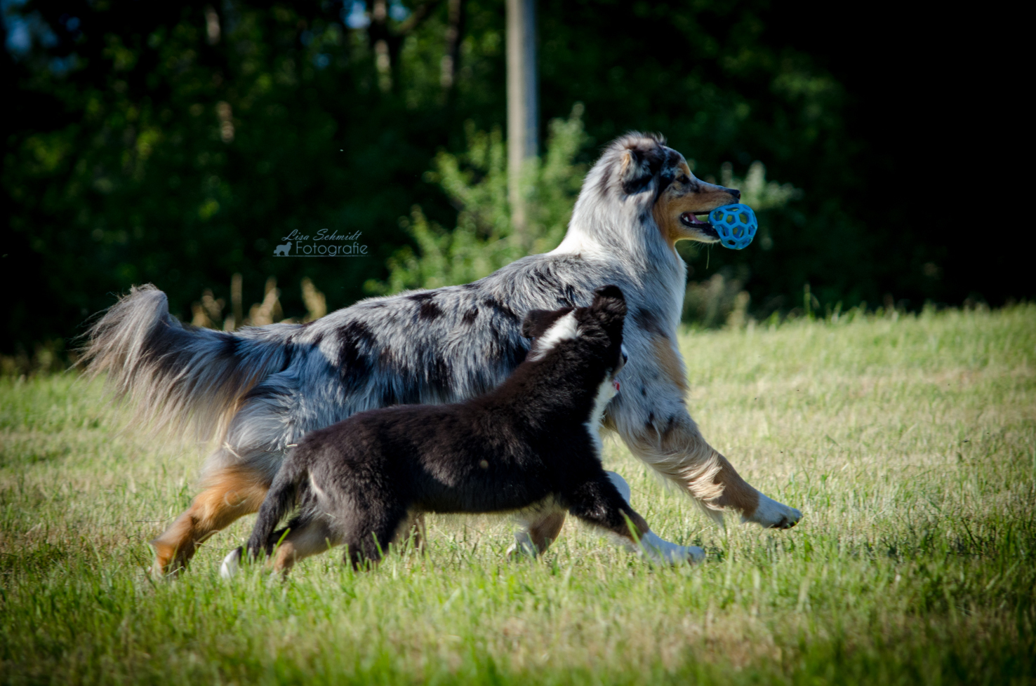 Nach einigen Jahren wurde der Wunsch nach einem zweiten Aussie immer größer. Ein Rüde sollte es lieber sein, da Tiva ja kein Fan von anderen Hunden/Hündinnen war. Zum Glück mochte sie Welpen aber immer, deswegen machte ich mir darüber eigentlich keine Gedanken. Als Tiva 6 Jahre alt war, zog dann Chovi ein. Sie war die allerbeste Zieh-Mami, die man sich vorstellen konnte. Sehr geduldig, eine ausdauernde Spielpartnerin, brachte ihm bestimmt und fair auch Manieren bei und war selbst auch super happy über ihren neuen Freund. Die beiden waren ein richtiges Dreamteam. Aber Tiva kam auch mit fast allen Hunden von Freunden gut aus, genauso wie mit engen Vertrauten von mir oder der Familie. Wen sie einmal in ihr Herz geschlossen hat, der gehörte sozusagen zum Rudel und wurde überschwänglich begrüßt, von oben bis unten abgeschleckt und mit den wildesten Tönen angekündigt. Sie war ein echter Charakterhund und nur durch sie durfte ich all die Erfahrungen sammeln, die mir heute helfen.