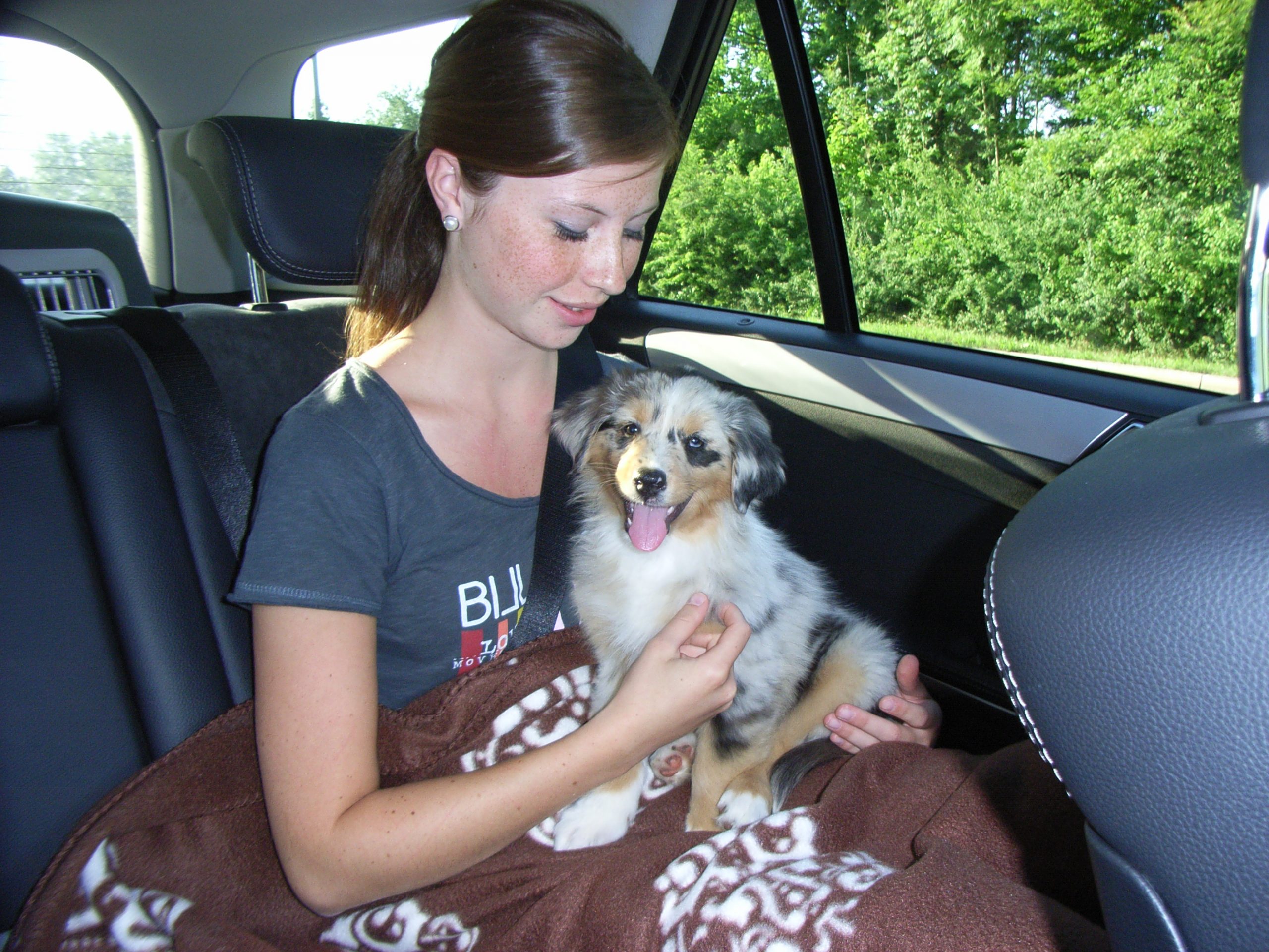 Drei Wochen später war Abholtag -wir haben für diesen Welpen sogar unseren Jahresurlaub gecancelt- und ich fuhr zusammen mit meinen Eltern die zwei Stunden nach Fürth. Alisha wurde umbenannt in Tiva, was indianisch ist und „Tänzerin“ oder „tanzend“ bedeutet. Flowerpower’s Princess Tiva. Princess weil sie als Welpe einen großen Fleck oben am Kopf hatte, der wie ein Krone aussah. Einen indianischen Rufname wollte ich, nachdem ich gelesen hatte, dass die Aussies bei den Indianern heilig waren. Gelesen habe ich in der Wartezeit bis zum Abholtag eh jedes Rasse- und Trainingsbuch, was ich finden konnte. Teilweise haben mich die ganzen Infos auch verunsichert, aufgrund der vielen Sachen, die man falsch machen könnte. Mit unserem Goldie hat meine Mama damals zwar sogar die Begleithundeprüfung abgelegt, wirklich gut erzogen war sie aber trotzdem nicht. Sie war goldietypisch einfach sehr nett. Dass ein Aussie nicht mehr einfach so mitlaufen würde, war mir scheinbar damals schon klar. Trotz dass uns niemand wirklich über die Eigenheiten dieser Rasse aufgeklärt hat.